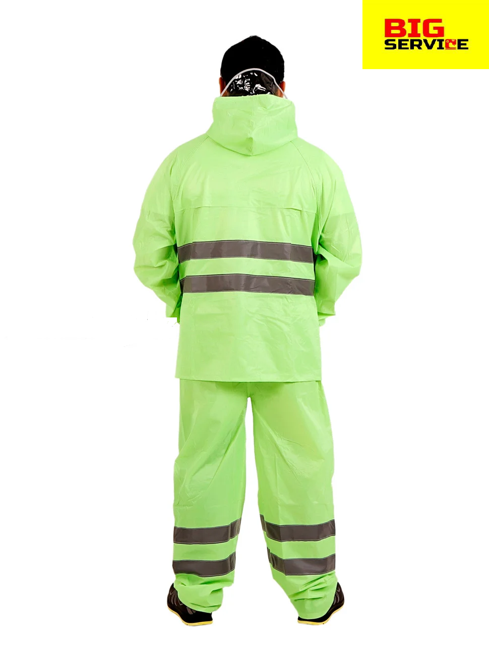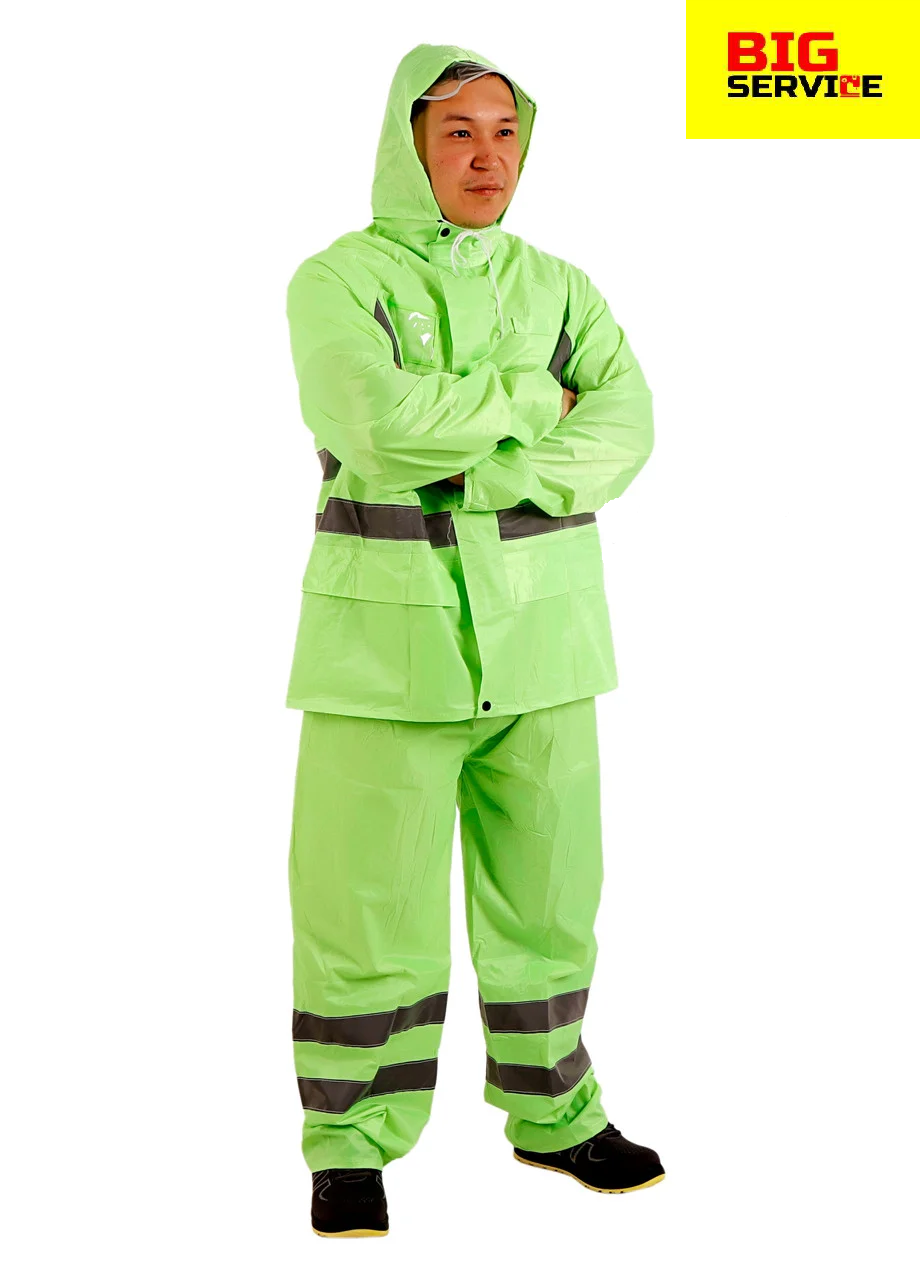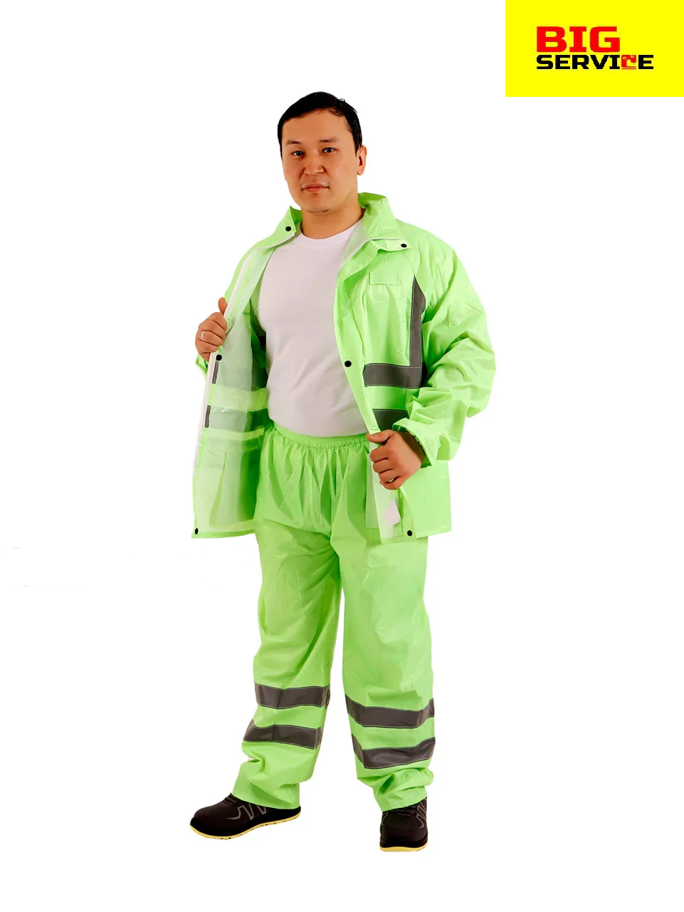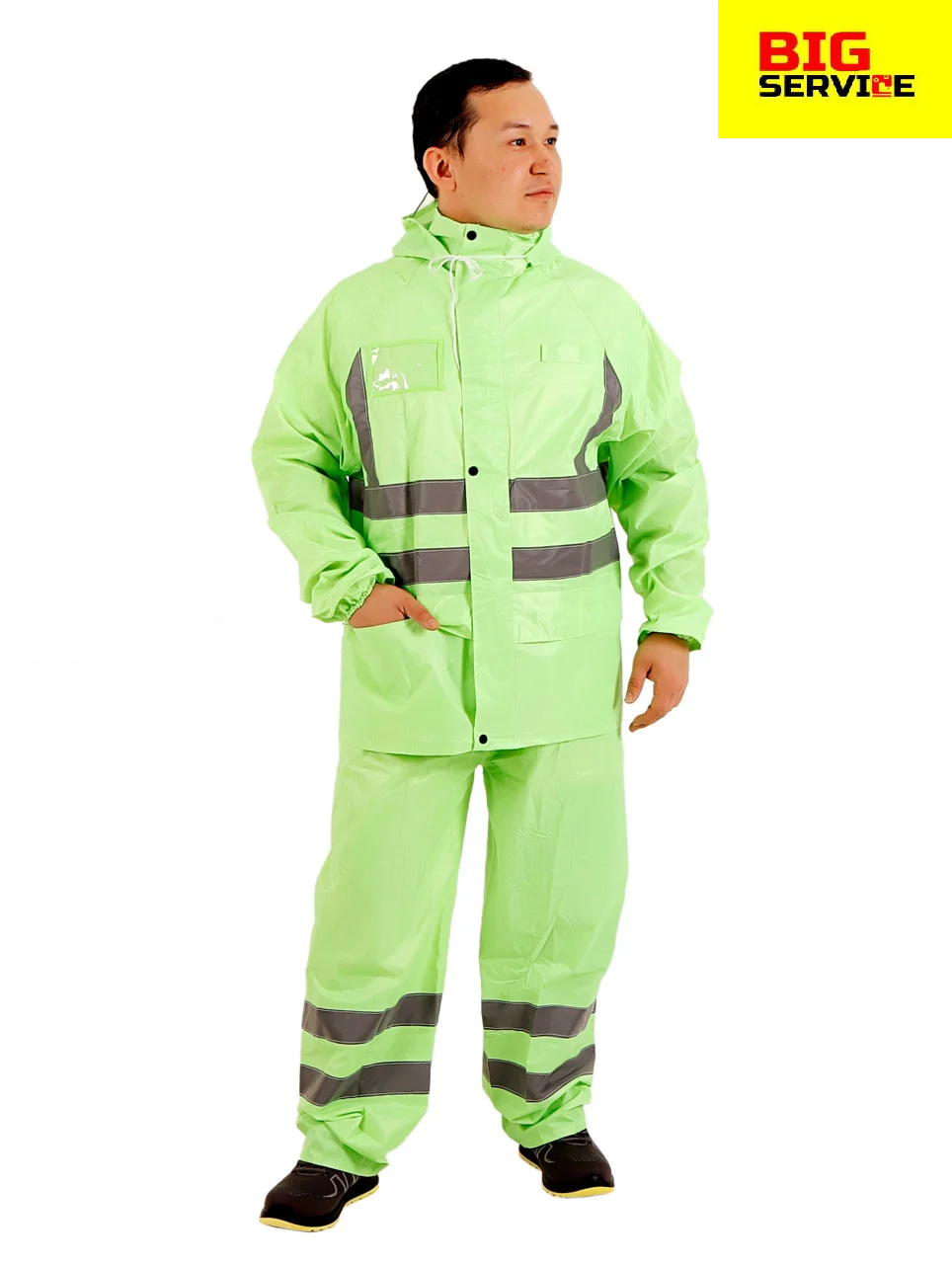 Изготовленный из плотного полиэстера с внутренним покрытием ПВХ, костюм обладает высокой степенью водоупорности и износостойкости. Материал эффективно препятствует проникновению влаги, не деформируется и легко очищается после загрязнений. Качественные швы дополнительно проклеены, что исключает протекания даже при длительном нахождении под дождём.