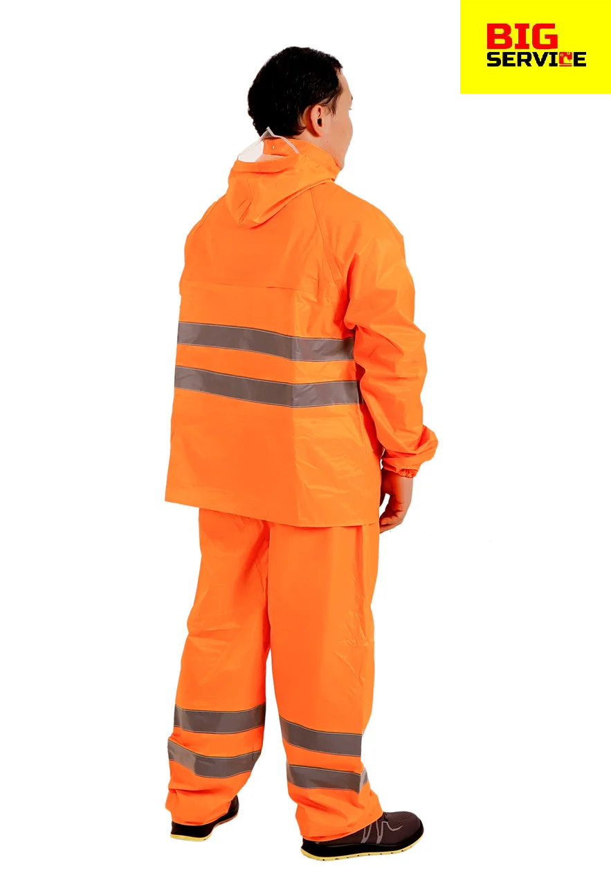 Комплект состоит из куртки и брюк, которые обеспечивают полную защиту тела от дождя и грязи. Куртка снабжена удобным капюшоном с регулировкой, позволяющим плотно закрыть голову и шею, а также застежкой на молнии с защитной планкой, предотвращающей попадание воды внутрь. Манжеты рукавов и низ брюк выполнены с утяжками или эластичными вставками, что дополнительно препятствует проникновению влаги.