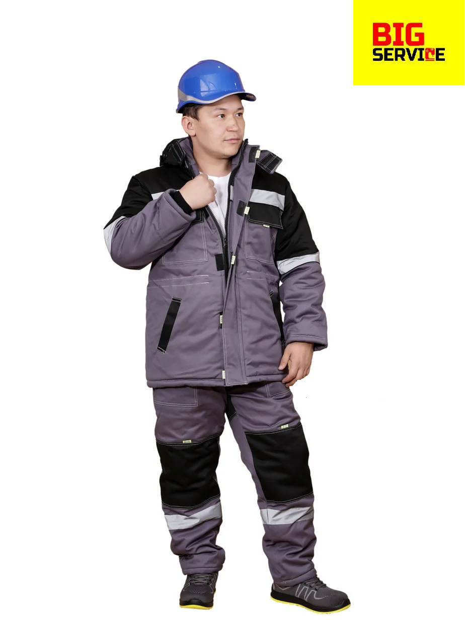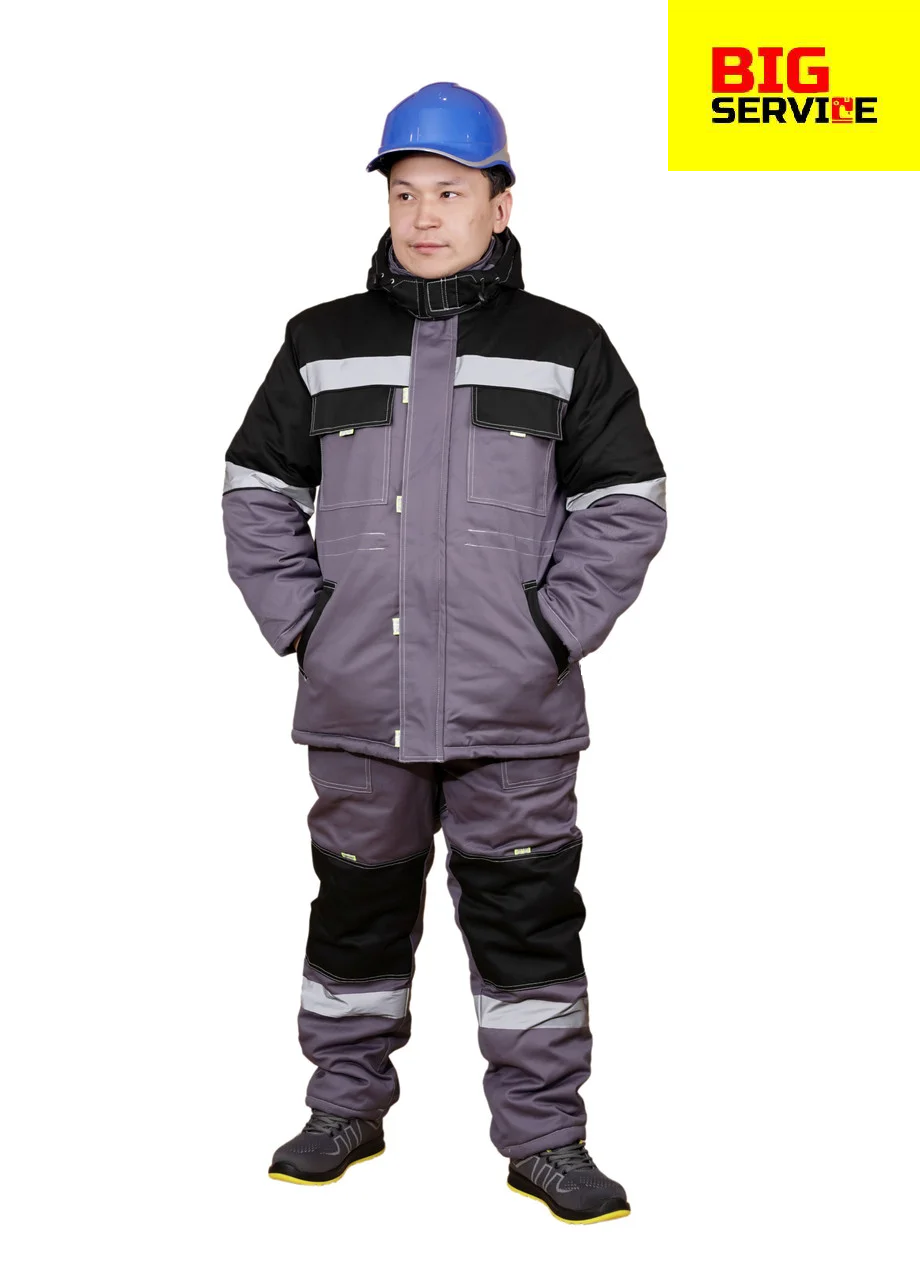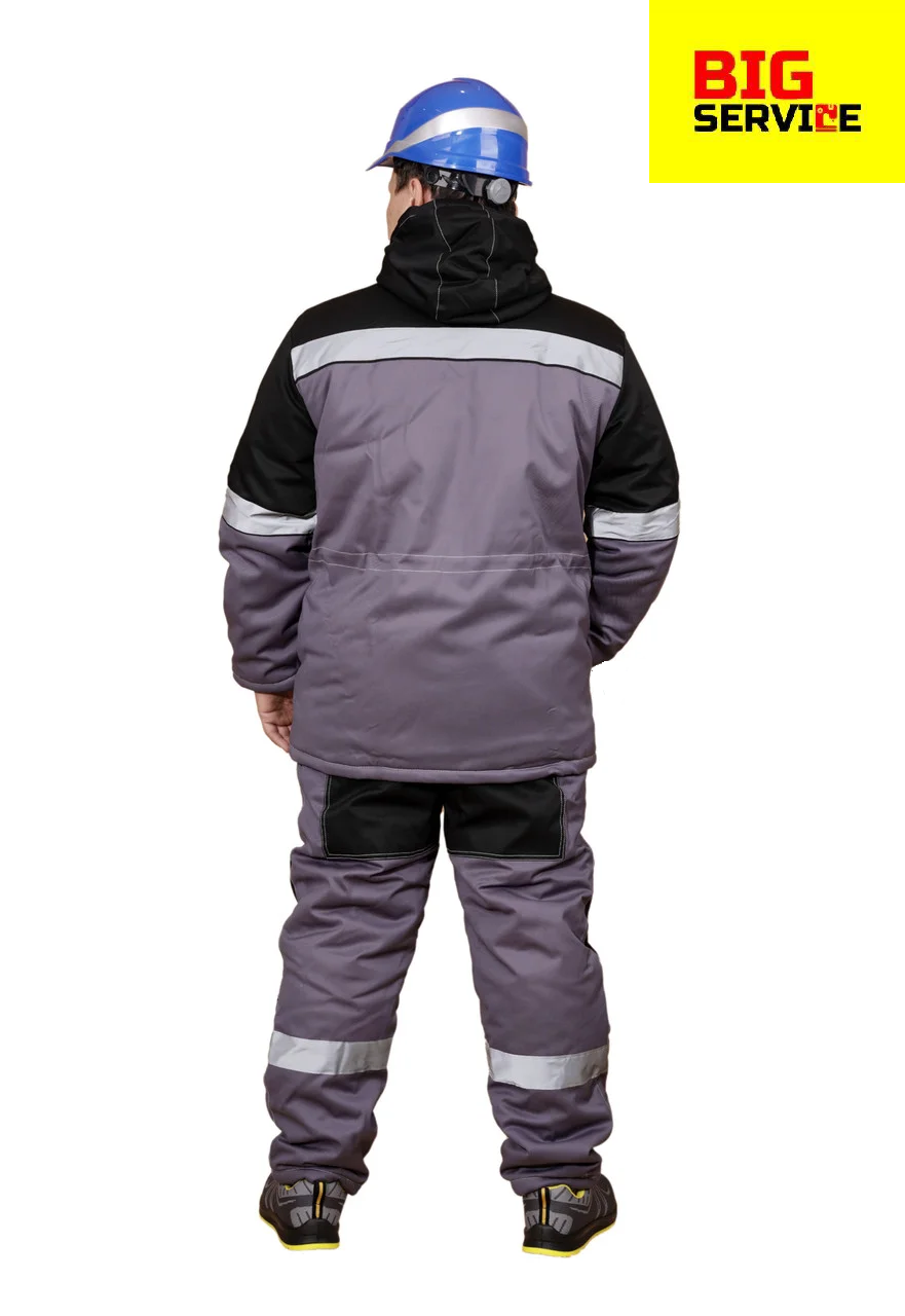 Куртка брюки. Куртка удлиненная, накладные карманы с клапанами, центральная застежка на пластмассовую молнию закрыта ветрозащитной планкой, светоотражающий , съемный утепленный капюшон. Полукомбинезон прямой крой, накладные карманы, гульфик на пуговицах, широкий утепленный пояс. Ткань 100%хлопок, плотность 260г/м2, пропитка ВО, утеплитель – синтепон.
