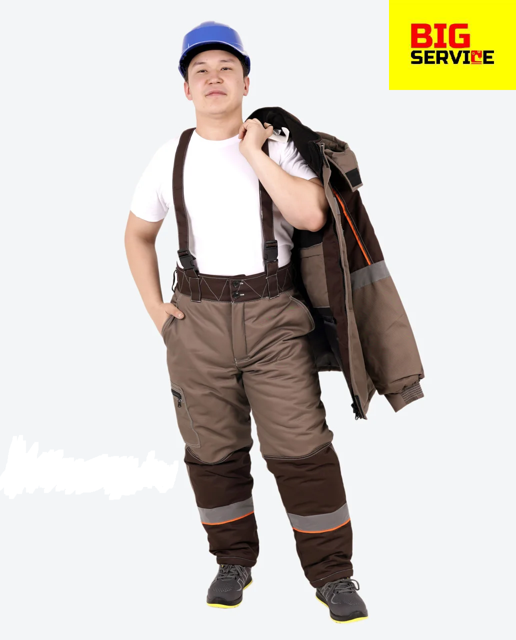 БРЮКИ прямые, с бретелями, с притачной утеплённой подкладкой, с центральной застежкой гульфика на тесьму «молния», широким фигурным поясом, с застежкой на поясе на две пуговицы, с тремя узкими шлевками на задних половинках и двумя щлевками-держателями фастексов на передних половинках. Внутренние боковые карманы с наклонным входом, с накладным карманом на правом боковом шве, застегивающимся на тесьму «молния». Наколенники на передних половинках, накладные задние карманы. СОП 50мм для обеспечения видимости.